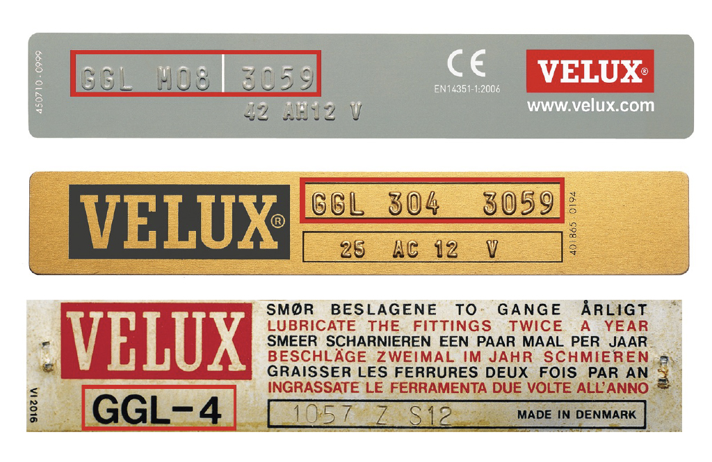 All VELUX roof windows have a unique three – part reference code. You can find the code on the identification plate located on the top of the window when opened as per image below.